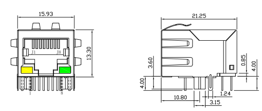 | Single Port RJ45 Modules with 10/100 Base-T Integrated Magnetics,Yellow/Green LED,Tab Down,RoHS | |