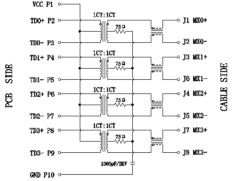 | Electrical Specifications @ 25℃ 1.Inductance: 350uH min, 100KHz, 100mV, 8mADC, J1-J2;J3-J6;J4-J5;J7-J8, LP. 2.Return Loss(dB Min): 1-40MHz:-18 40-60MHz:-14 60-80MHz:-12 80-100MHz:-10 3.Crosstalk: 1-100MHz:-30dB Min 4.Insertion Loss: 1-100MHz:-1.0dB Max 5.CMR: 1-100MHz:-35dB Min 6.Turns Ratio: 1CT∶1CT 7.Isolation Voltage: 1500Vrms/60Hz 8.Operating Temperature Range: 0℃-70℃ / -40℃- +85℃. | |||
