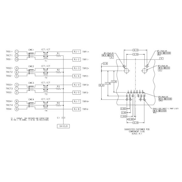 •Open Circuit Inductance (OCL): 350uH MIN @100kHz, 0.1VRMS, 8mA DC Bias from 0°C to 70°C, All Four Pairs