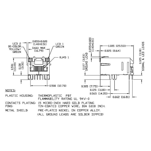 08B0-1K1T-06-F 10/100BASE-T Magnetic Rj45 Jack 1X1 Port Tab Up YG/G Led Images |